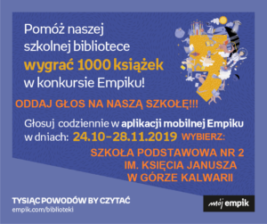 Szanowni Państwo!Bierzemy udział w konkursie Empiku. Nasza szkolna biblioteka może wzbogacić się o 1000 książek. Cenny jest każdy głos!