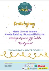 Niezmiernie nam miło poinformować Państwa, iż klasa 2b wraz z Paniami Anetą Bielską i Dorotą Uścińską-zrealizowała pierwszy moduł Innowacji Pedagogicznej EmocJa „Kreatywność” uzyskując tym samym dostęp do kolejnej części projektu.