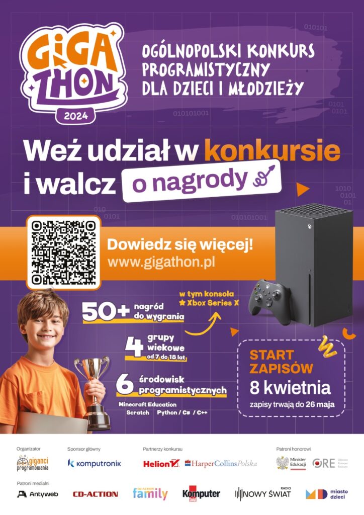 Zachęcamy wszystkich uczniów do wzięcia udziału w II edycji Ogólnopolskiego Konkursu Programistycznego Gigathon, który objęty został patronatem honorowym Ministra Edukacji. Konkurs jest doskonałą okazją dla młodych pasjonatów technologii, aby sprawdzić swoje umiejętności programistyczne i zawalczyć o wyjątkowe nagrody.