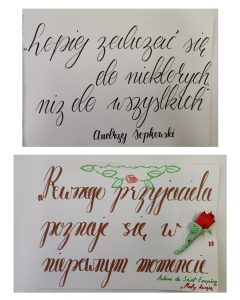 Na początku listopada ogłosiliśmy konkurs na najpiękniejsze pismo. Zadaniem uczniów było wybranie ulubionego cytatu i zapisanie go ozdobną czcionką brushpenami, piórem, cienkopisami lub innym pisakiem do kaligrafii.